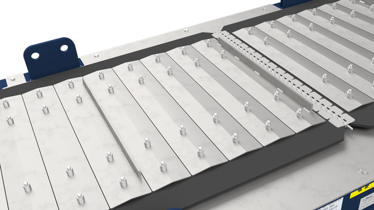 A metal clad belt developed by Dings Co. Magnetic Group as a long-life magnet cleaning belt for installations where many sharp-edged iron objects are encountered—especially useful when recycling concrete with rebar. Continuous impacts from sharp steel can cause rapid wear on standard cleaning belts. The entire impact area on a ‘Durabelt’ is protected with an armored barrier of thick stainless-steel pads. The self-cleaning belt travels continuously around the separator, automatically discharging the attracted ferrous. Individual plates can be easily replaced in the field, saving costs on belt replacement and reducing downtime.