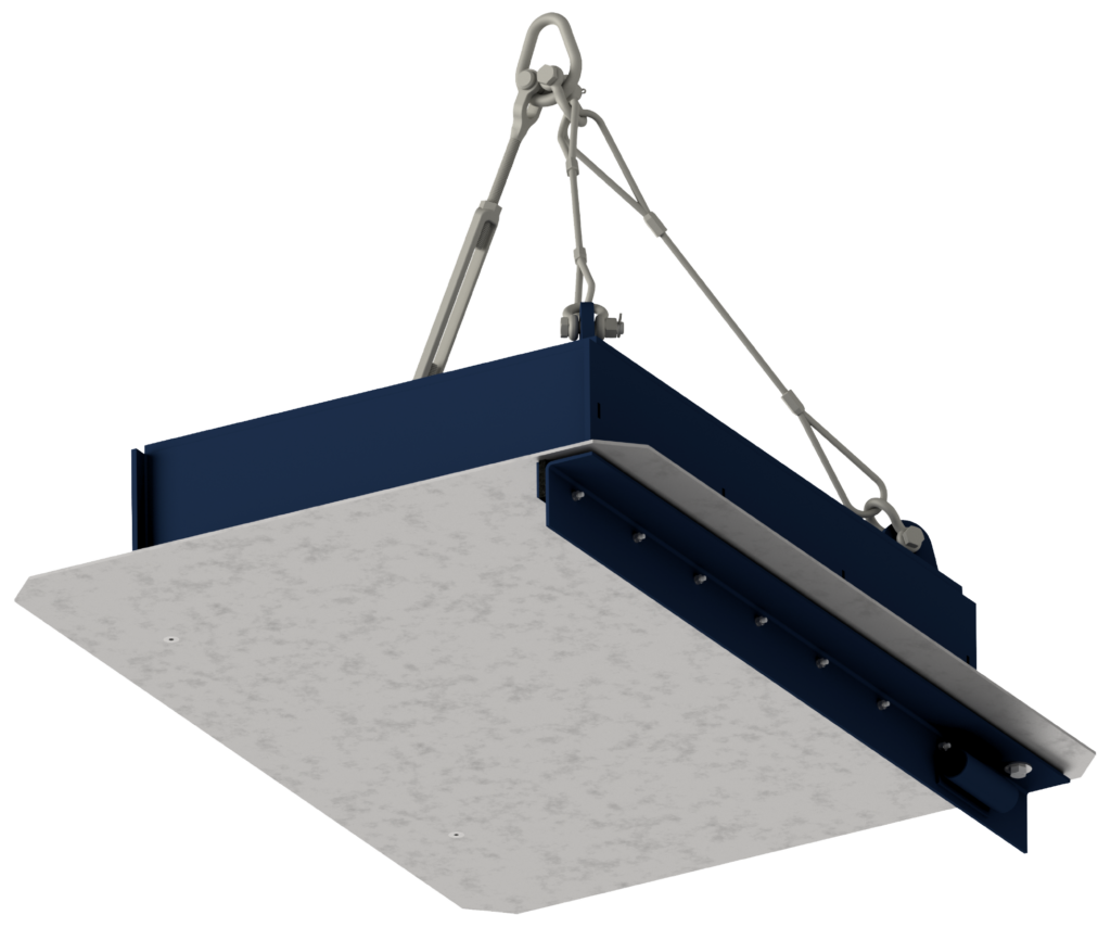 Stationary Magnetic Separator models are maintenance-free with no moving parts (no lubrication, no tightening or replacing of hardware needed). Ferrous metal is pulled out of the material stream to the face of the overhead permanent magnet. Any ferrous metal that is attracted to the magnet face is held in place until manually removed. Designed specifically for easy installation; this magnetic separator comes with a 3-point suspension system (4-point suspension available) that includes two cables and one turnbuckle connected to a common bull ring. Adjustment of the magnet suspension angle is easy and only involves adjustment of the turnbuckle. There is no measuring, shortening, lengthening or cutting of cable required.